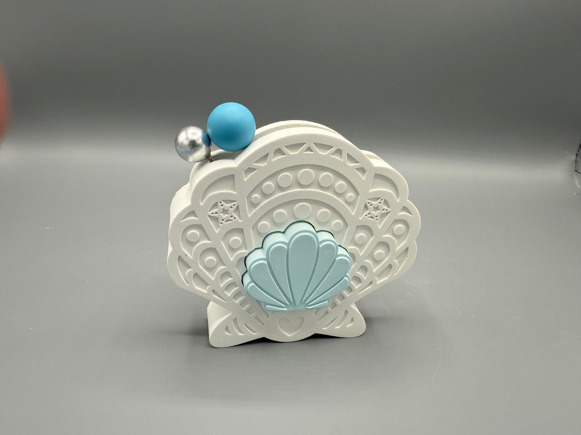 Diese dekorative Muschelfigur im edlen Weiß überzeugt durch ihre filigrane Gestaltung mit feinen Mustern und ausgestanzten Details. Der zarte Muschelaufsatz in Hellblau setzt einen sanften Farbakzent und sorgt für eine moderne Note.